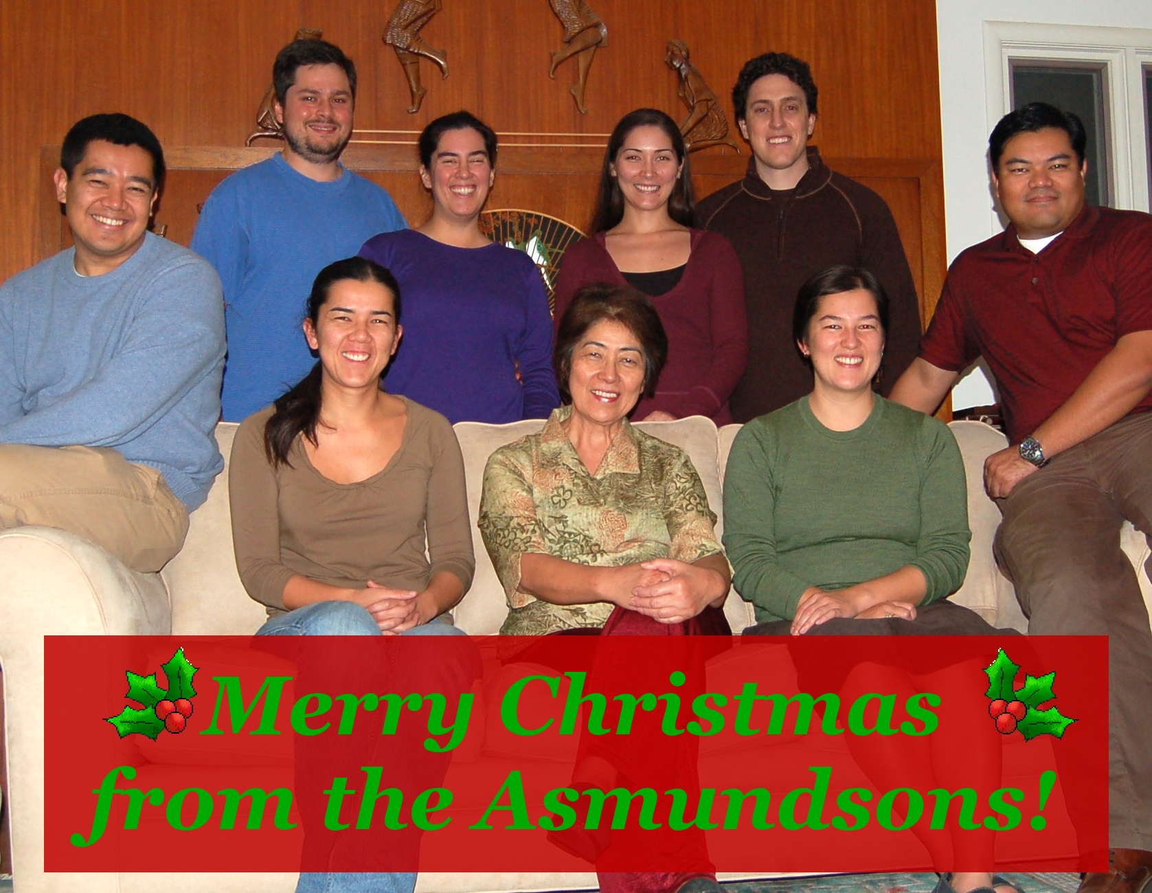 We all enjoyed a wonderful Thanksgiving with Vigfus' siblings. Fortunately for all of us at this annual tribute dinner to Grandfather Asmundson's research, a new midprandial perambulation tradition has been instated. The picture on the postcard is a rare one of the Asmundson clan together under one roof. We hope that we will also soon be with each of you sharing a meal under one roof. Until then, have a wonderful holiday season and a lovely new year!